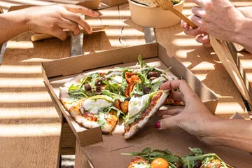 Everything can be enjoyed on the spot around large convivial tables, or be taken away.
