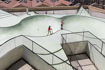 Sur la terrasse publique adjacente à La Tour, l’artiste coréenne Koo Jeong A a conçu un vaste skatepark phosphorescent. Les cuves de skate sont recouvertes d’une peinture luminescente qui, à la nuit tombée, révèle toute la structure du terrain fait de courbes, et génère différentes conditions de luminosité. Cette œuvre, jouant des nouveaux codes de la culture contemporaine, aborde les notions de jeu et de performativité. OooOoO est une illustration puissante de ce que peut signifier le fait de s’engager dans une pratique avec des compétences bien réelles mêlant exercices imposés et liberté de style. Le skate est aussi une chorégraphie dans l’espace, avec sa propre vélocité et sa gestuelle. Les corps des skateurs réussissent à performer des positions remarquables d’équilibre, d’effort et d’endurance, et renouvellent radicalement l’expérience de l’espace architectural et urbain tel que nous l’appréhendons habituellement.